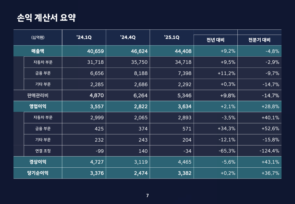 📌 판매량은 소폭 감소했지만, 하이브리드 판매 확대와 금융 실적 개선 덕분에 매출은 9.2% 증가했어요.